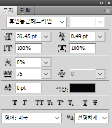 만약 자세한 설정을 해 주고 싶다면, 창 메뉴에서 문자 탭을 누르면 창이 뜨는데, 이 창에서 서체와 줄 간격 폭 넓이, 굵게, 기울임꼴, 위 첨자, 아래 첨자 등을 전부 선택이 가능하다.