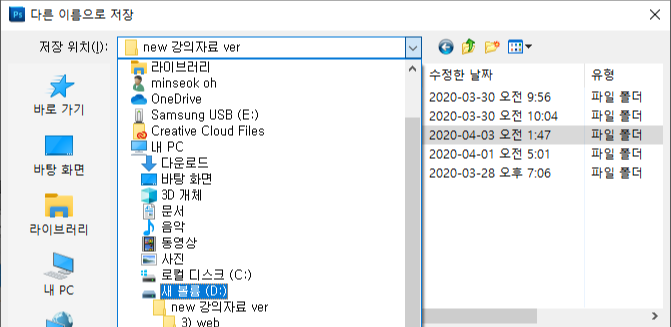 절대 psd파일은 지우지 말 것. 언제 또 수정해야할지 알 수 없으므로 제출 경로 파일이 아니라, D드라이브 같은 곳에 본인이 작성한 psd파일을 보관하라. psd파일을 저장했다면 이번엔 ctrl+ shift+ alt+ s를 눌러 웹 및 장치용으로 저장을 클릭하자.