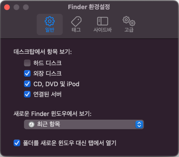 - 새로운 Finder 윈도우에서 보기 : 새로 윈도우를 만들 때, 최초로 띄워지는 폴더 경로와, 새로운 윈도우 경로를 고를 수 있다.