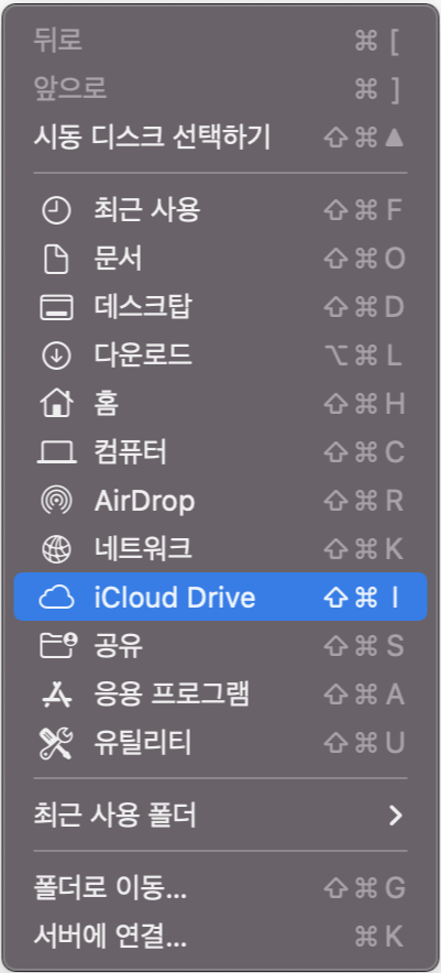 최근 사용, 문서, 데스크탑, 다운르도, 홈, 컴퓨터, Air drop, 네트워크, 아이클라우드, 공유, 응용프로그램, 유틀리티 등 다양한 경로가 사전에 미리 단축키 세팅이 되어 있다. 본인에게 잘 맞는 경로의 단축키를 잘 외워두자.