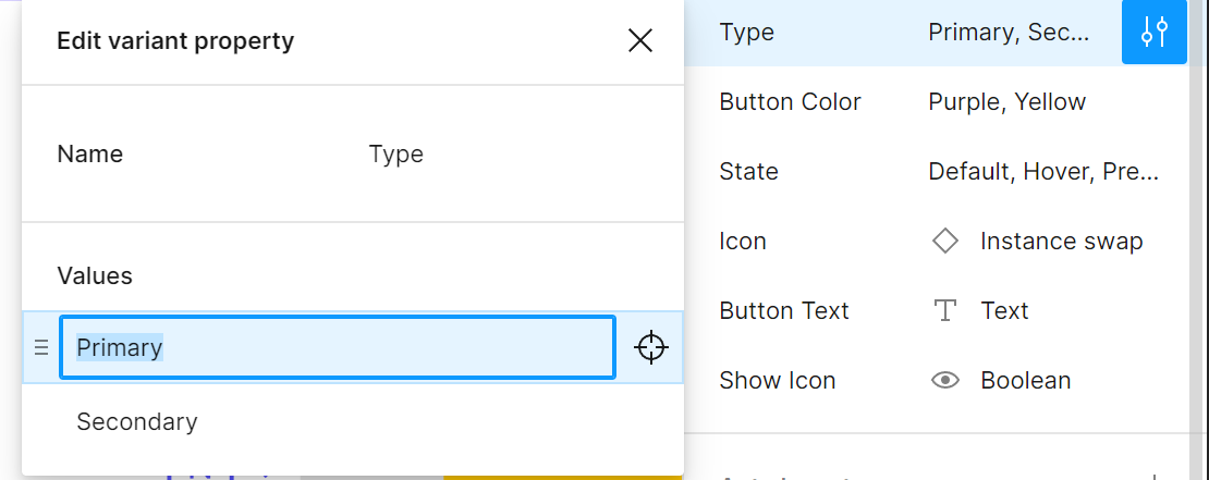 2. 프로퍼티 편집 모달 창을 열기 위해 variant 프로퍼티 옆의 아이콘 클릭
