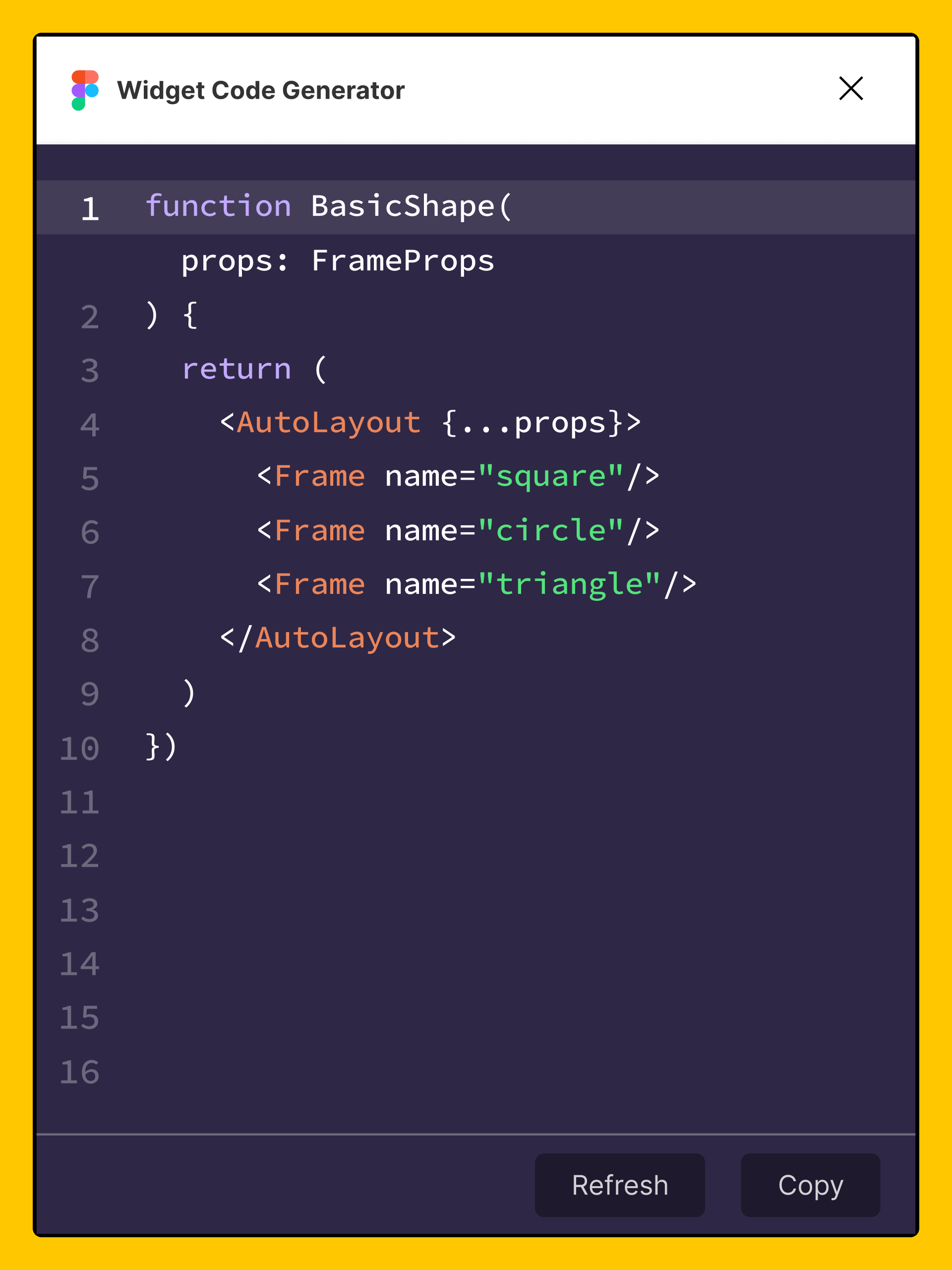 해당 요소를 코드로 생성해주는 플러그인으로, figjam 위젯을 디자인하고 디자인을 코드로 손쉽게 편환할 수 있다. 이 플러그인은 위젯 인터페이스를 생성하기 위해 복사하고 사용할 수 있는 코드를 생성한다. 위젯에 기능을 추가하려면, 생성된 코드를 편집해야 한다.