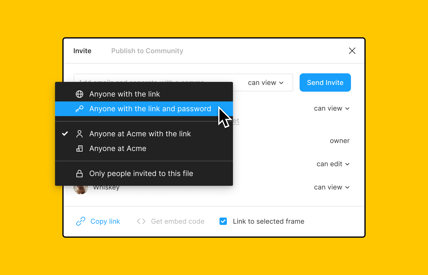 링크가 있으면 누구든 들어갈 수 있지만, 암호가 있도록 설정할 수 있다. 피그마 공유하기 모달에서 접근이 가능하다.