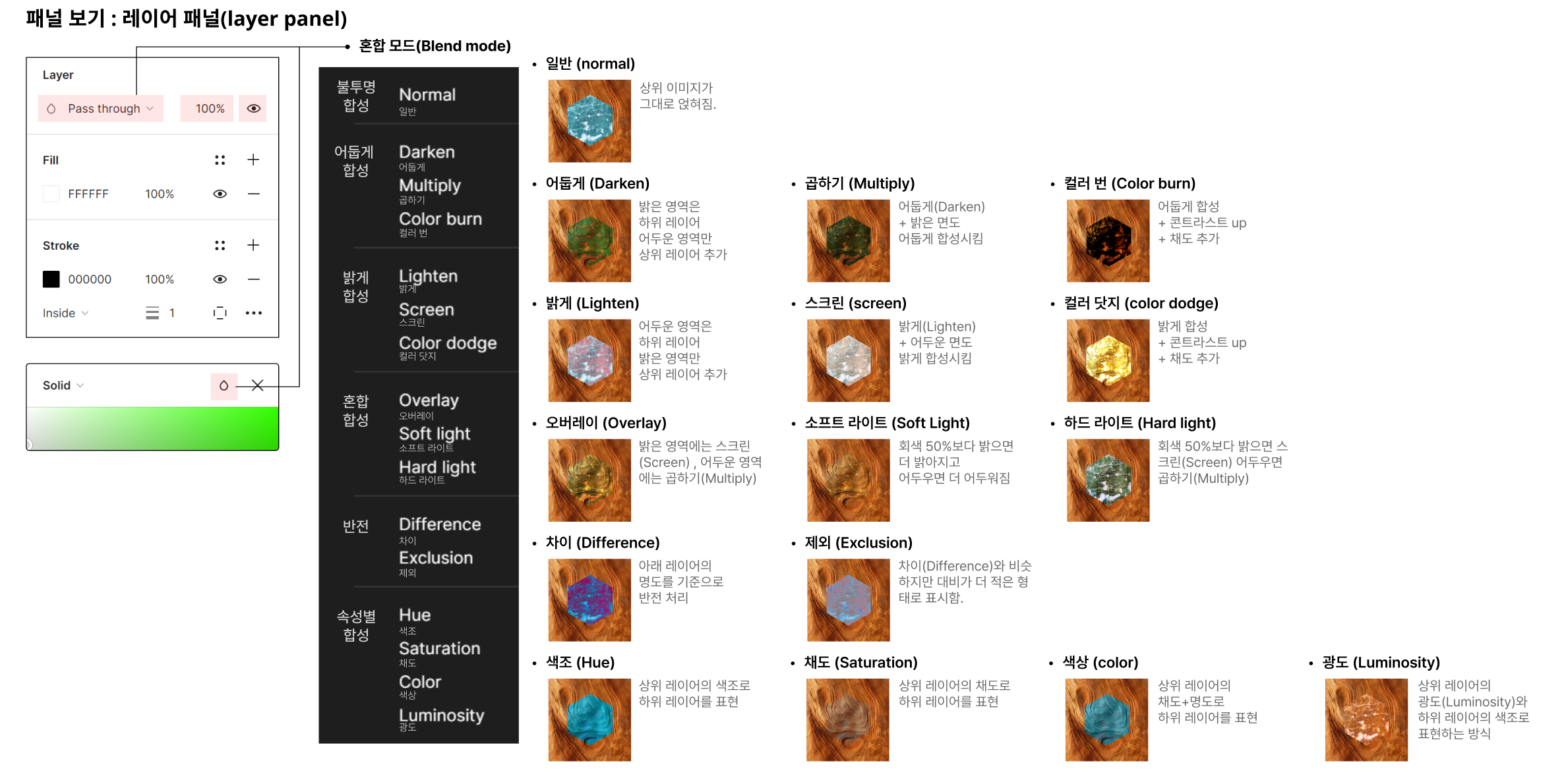 - 색조 (Hue) : 상위 레이어의 색조로 하위 레이어를 표현.