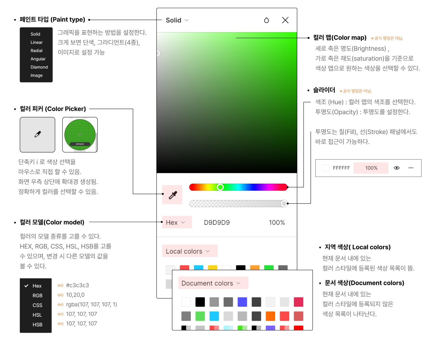 색상 패널에서는 페인트 타입, 컬러 피커 도구, 컬러 맵, 슬라이더, 지역 색상 및 문서 색상 확인이 가능하다.