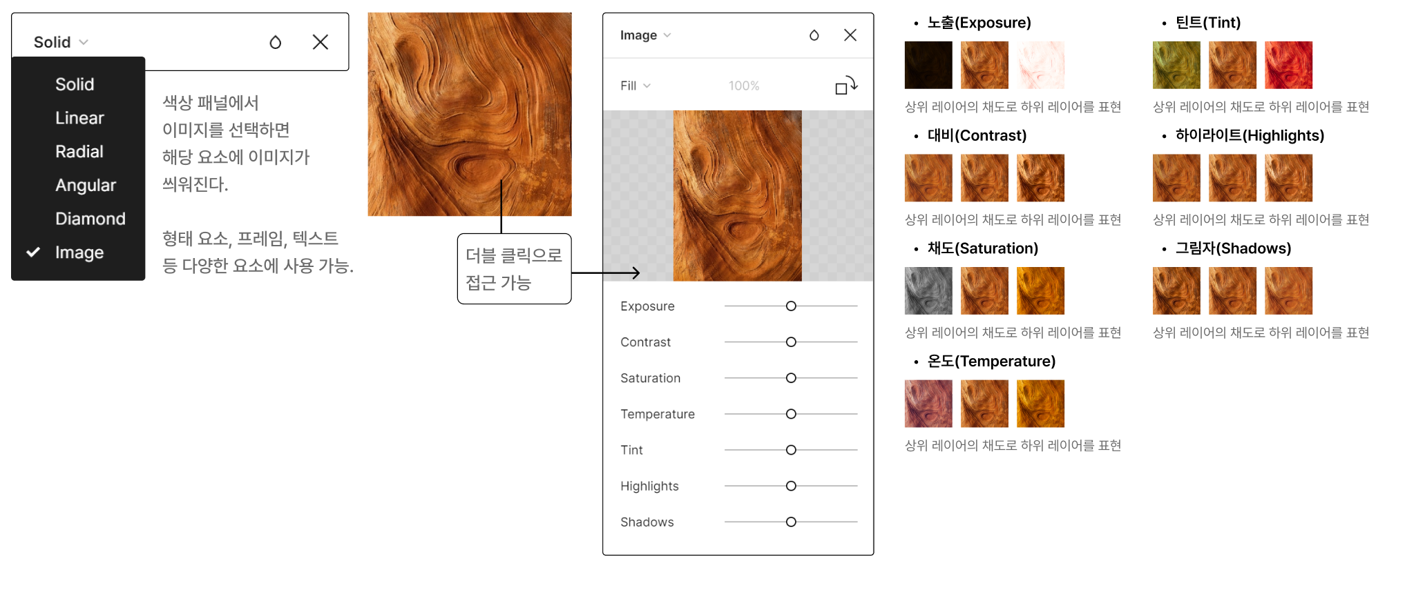 또한 이미지 편집 시에는 간단한 컬러 보정을 할 수 있는 기능이 존재한다. 노출, 대비, 채도, 온도, 색조, 하이라이트, 그림자 옵션을 조정하여 원하는 이미지 형식으로 보정해 보자. 단, 해당 기능은 포토샵에 비해 색상 변경 범위가 넓지 않으므로 주의가 필요하다.