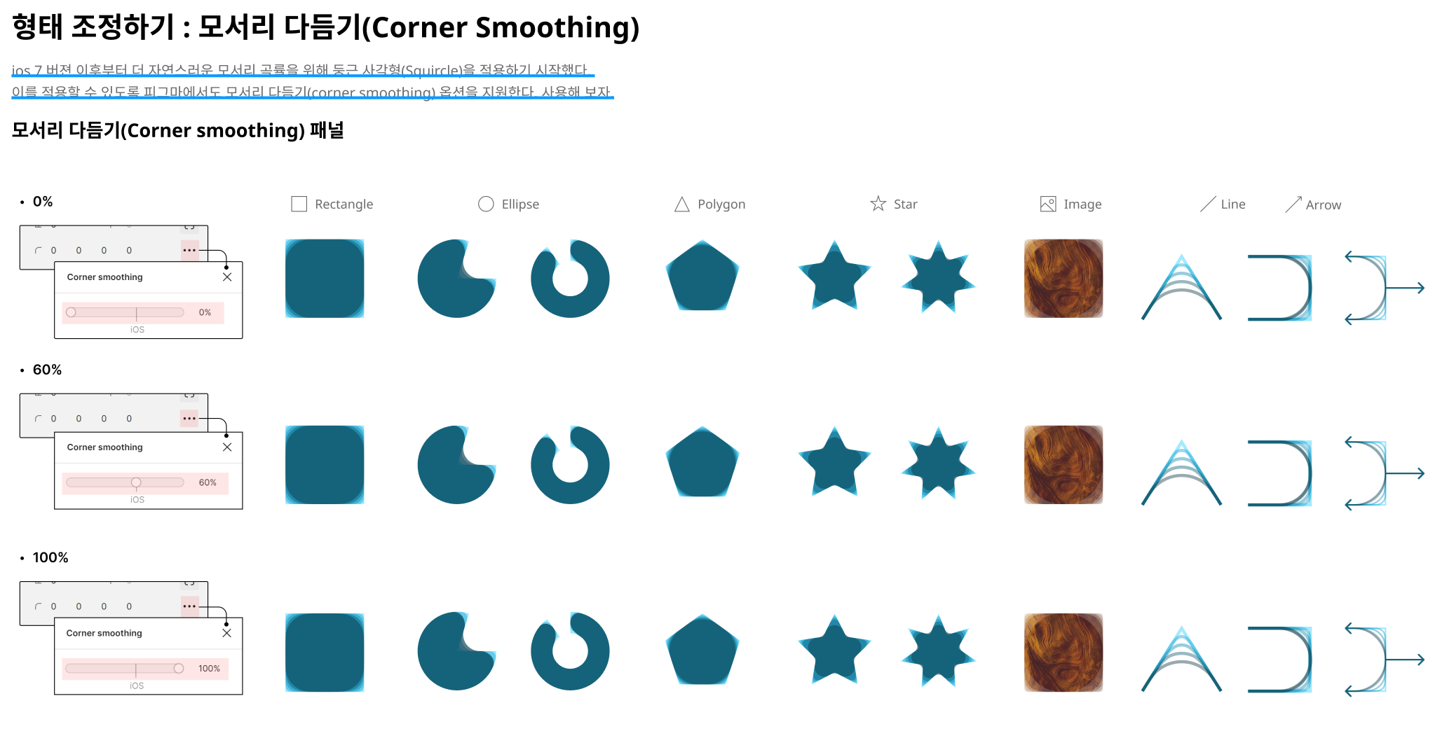 이를 적용할 수 있도록 피그마에서도 모서리 다듬기(corner smoothing) 옵션을 지원한다.