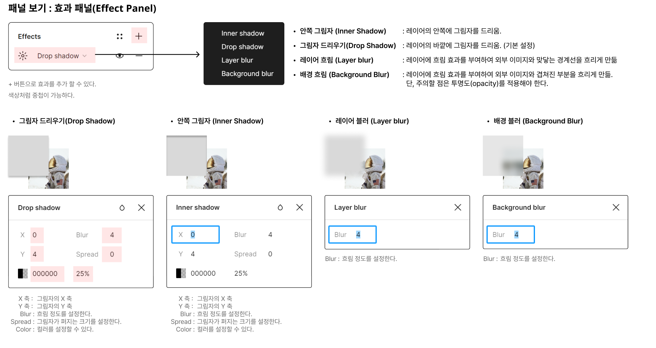 효과 패널(Effect Panel)에서 적용할 수 있는 효과는 그림자(Shadow)와 흐림(Blur)이 있다.