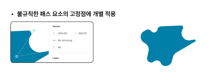 해당 패스의 고정점을 선택하면 해당 고정점의 둥글리기를 꼭지점별로 지정할 수 있다.