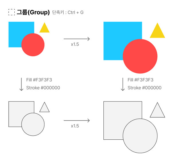 - 그룹(Group) : 여러 요소를 하나의 묶음으로 관리하는 기능. 단독으로 생성할 수도 없다. 묶음이기 때문에 리사이징시 하위 요소들의 크기가 변한다.