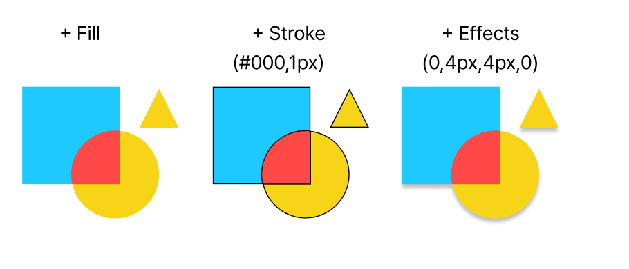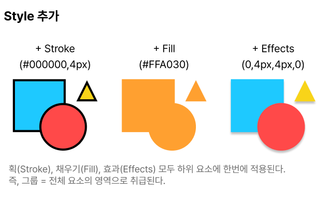획(Stroke), 채우기(Fill), 효과(Effects) 모두 하위 요소에 한번에 적용된다.