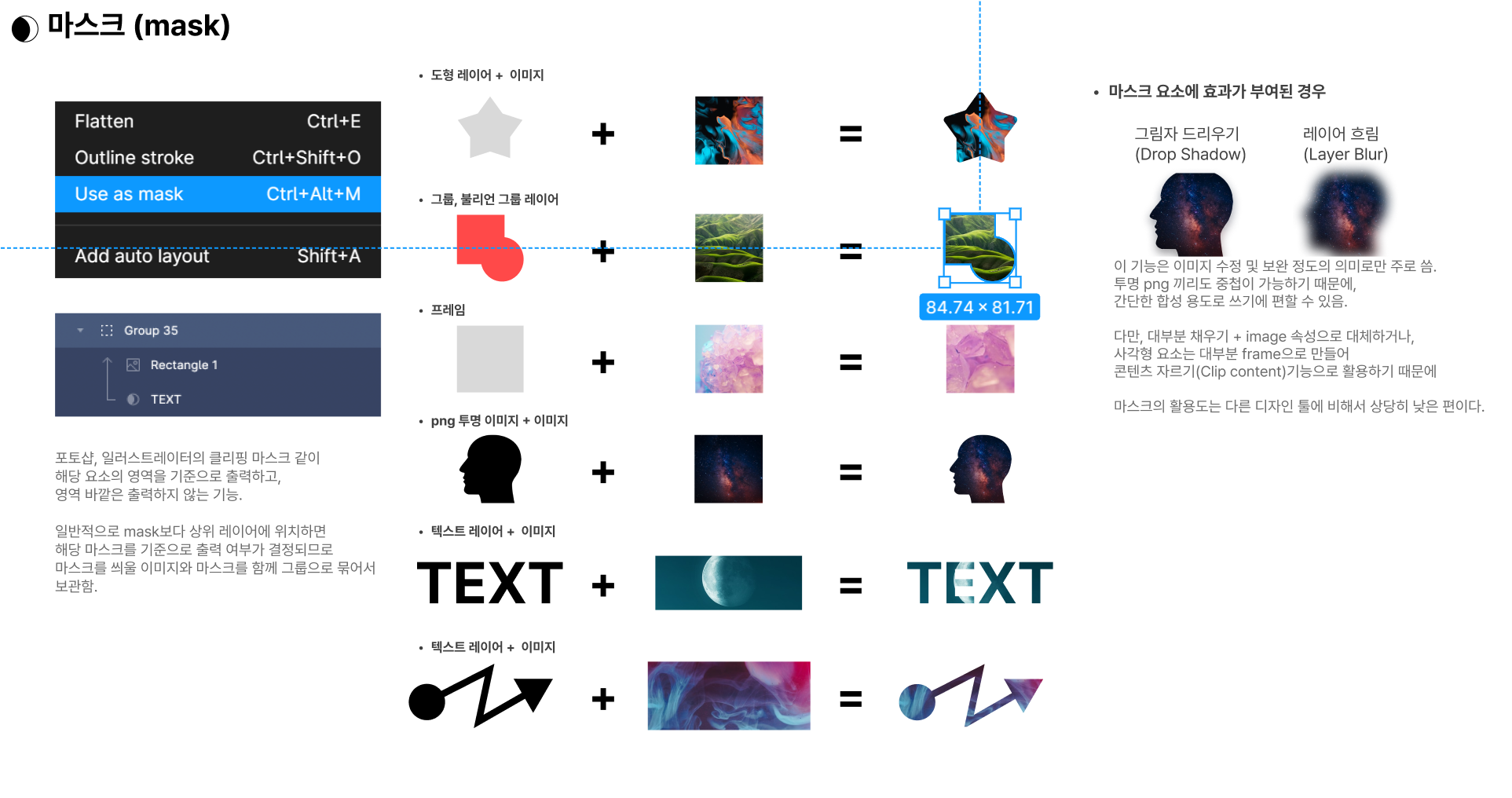 일반적으로 mask보다 상위 레이어에 위치하면 해당 마스크를 기준으로 출력 여부가 결정되므로