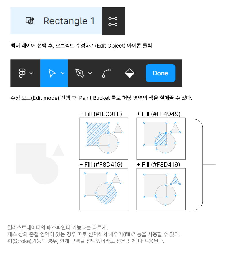단, 획(Stroke)의 경우에는 일부분만 수정할 수 없다. 전체 영역의 모든 패스가 하나로만 관리된다.