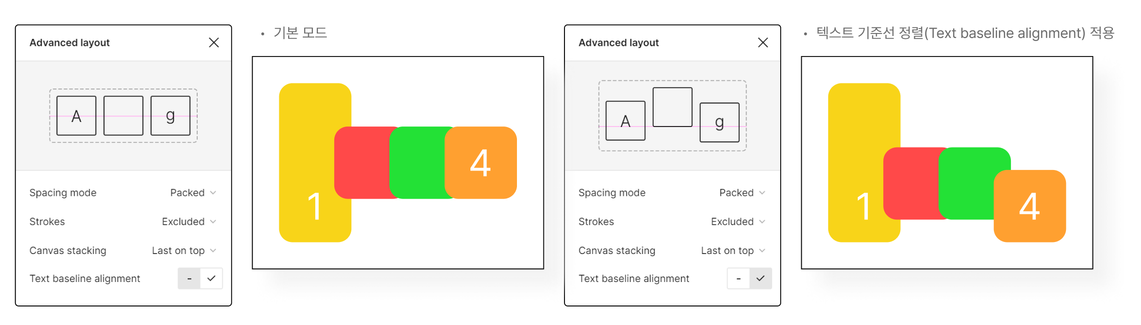 여기서는 배치 모드 바꾸기(Spacing mode), 레이아웃의 획 영역 기준 설정(Stroke), 누적 순서(Canvas Stacking), 텍스트 기준선 정렬(Text baseline alignment) 기능을 원하는대로 설정해 줄 수 있다.