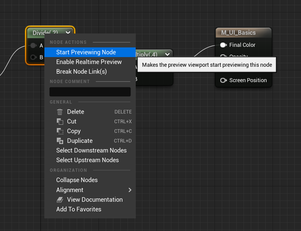 중간 과정에서 출력을 원한다면 해당 노드를 선택하고 노드 미리보기 시작하기(Start Previewing Node)를 선택합시다.