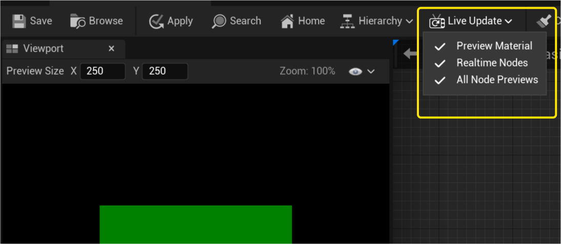 저장 또는 적용 버튼을 사용하지 않고 변경 사항이 재질 미리보기 뷰포트에서 실시간으로 자동 업데이트 됩니다.