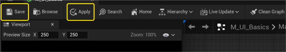 기본적으로 언리얼의 머티리얼은 '저장(Save)' 또는 '적용(Apply)' 버튼을 눌러야만 오브젝트에 적용할 수 있습니다.