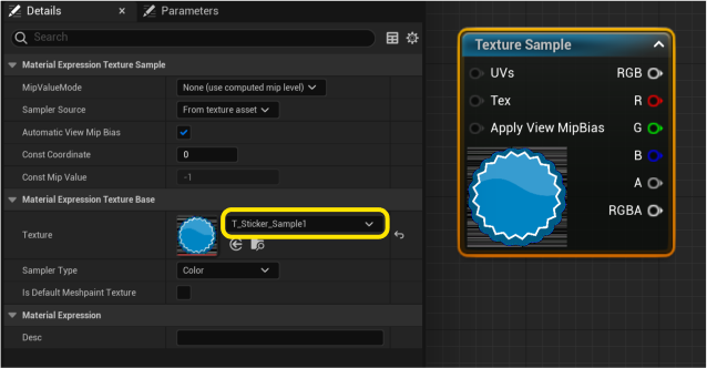 만약 머티리얼을 변경하고 싶은 경우, Texture Sample 노드를 선택하고,