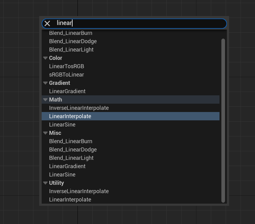 머티리얼 에디터에서 Linear Interpolation 표현식을 불러옵시다.