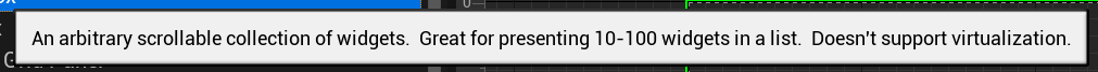 An arbitrary scrollable collection of widgets. Great for presenting 10-100widgets in a list. Doesn't support vitualization.