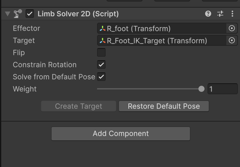 각각의 IK 오브젝트의 Limb Solver 2D 컴포넌트에서 Effector를 지정한다. Effector는 각 IK 오브젝트의 이름과 맞도록 설정한다.