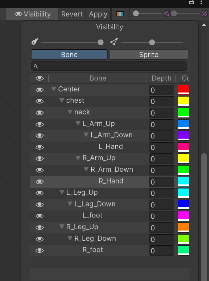 상단의 Visibility를 켜서 본의 이름과 구조를 정리한다. 위 이미지처럼 하이어라키 구조에 유의하여 만든다.
