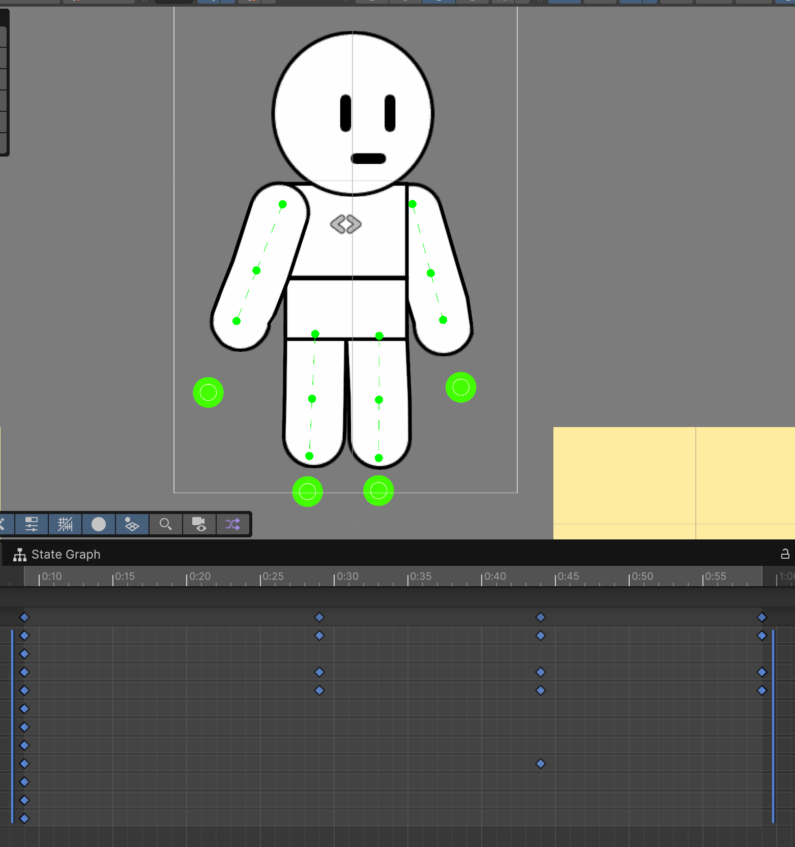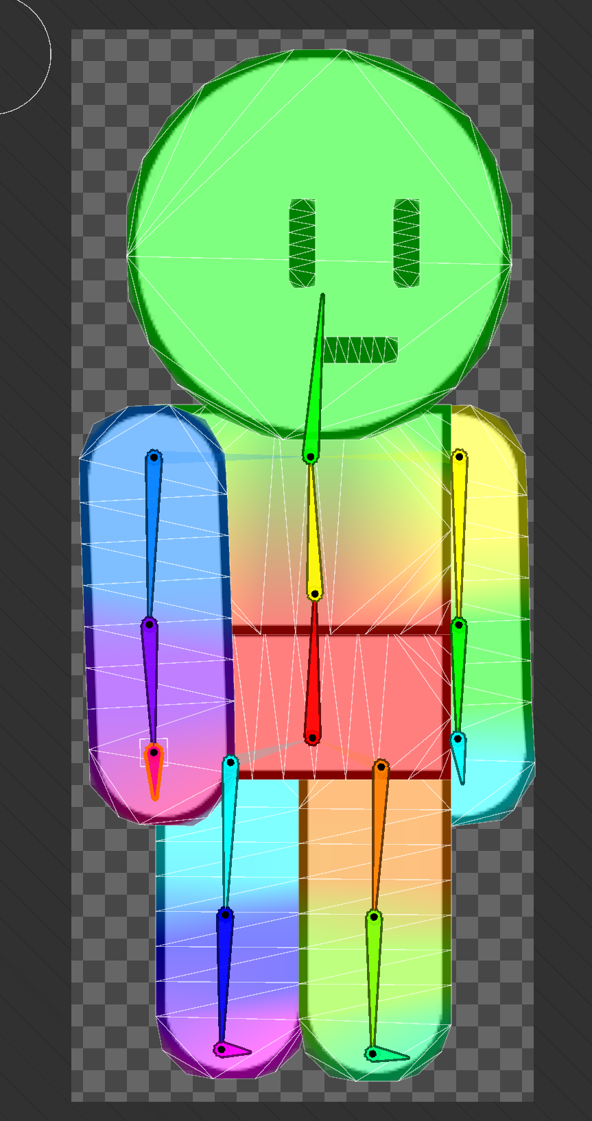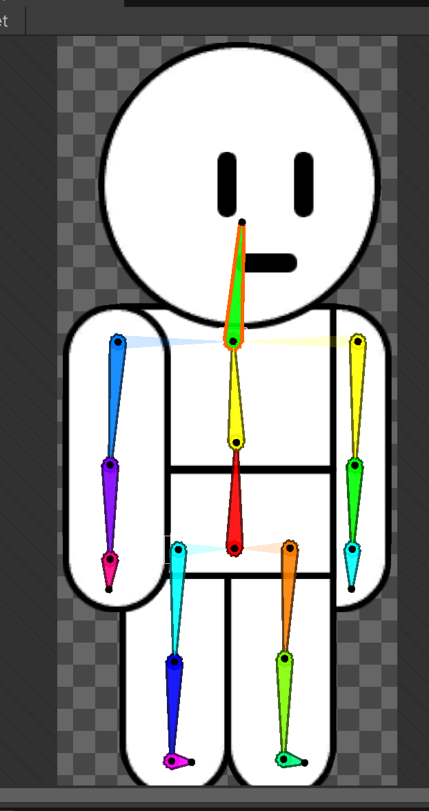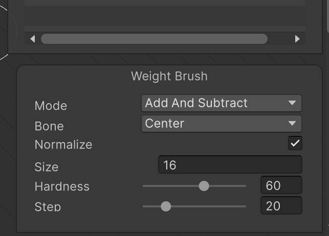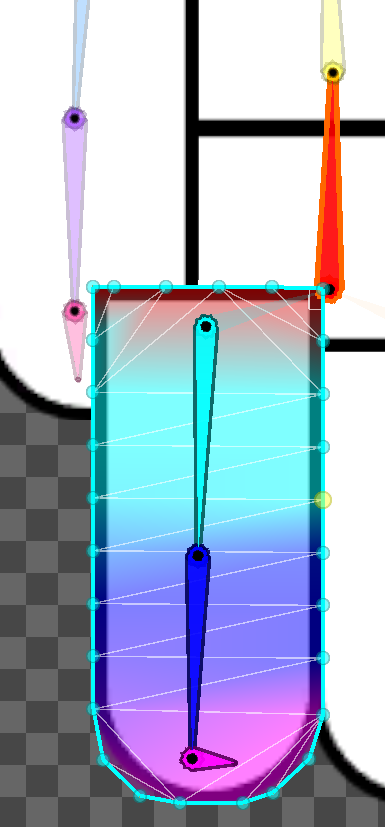 이 때 서로 다른 본을 참조하는 경우 Weight Brush로 개별 스프라이트와 본을 연결짓는다. 본을 선택하고 브러쉬를 Vertex에 부으면 Weight값이 부여된다. 주의할 점은 Weight Brush의 Hardness 값이 너무 낮으면 제대로 weight 가 부여되지 않으므로 hardness값을 잘 부여해야 한다.