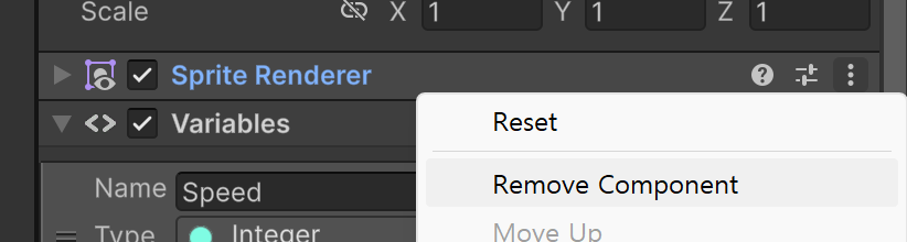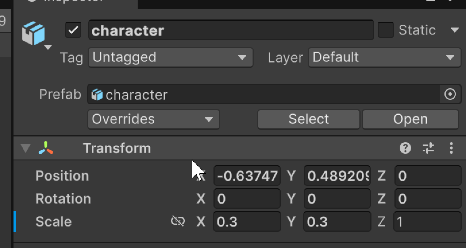 Character의 스케일을 0.3 /0.3 / 1 로 지정한다.
