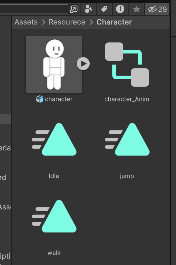 그리고 동일 위치에 애니메이션도 Idle, Jump, Walk State 상태에 맞춰서 생성한다.