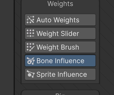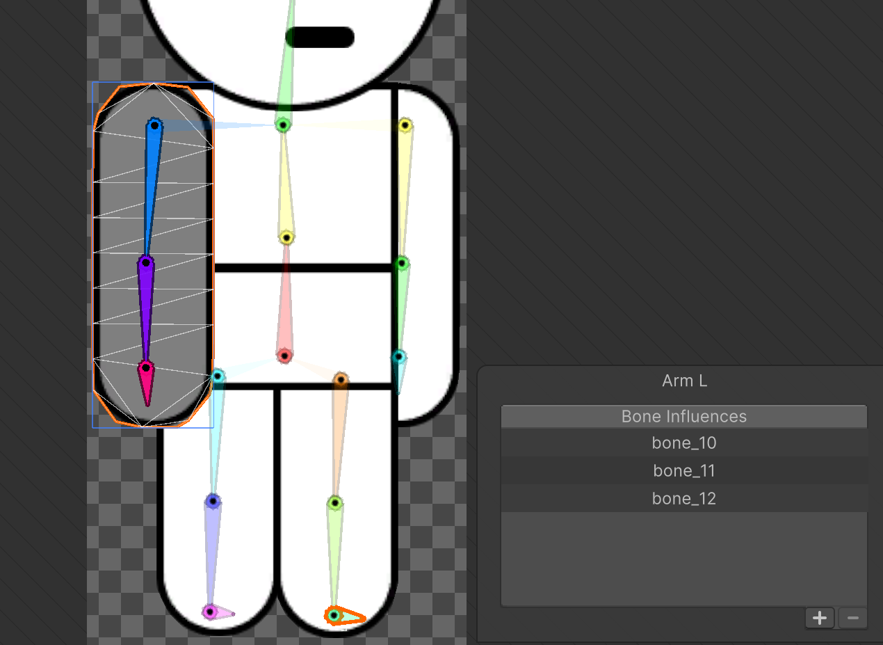 Bone Influence에서 본과 스프라이트를 연결합니다. 스프라이트를 선택하고 본을 클릭한 후 우측의 + 버튼을 누르면 스프라이트에 영향 받을 본을 선택할 수 있습니다.
