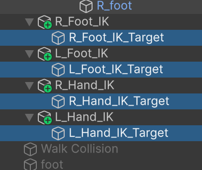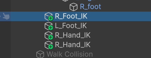 + 버튼을 눌러 IK를 생성하고 각각의 이름을 위와 같이 바꾼다. 이름 바꿀 때는 하이어라키 창에서 직접 바꾸면 된다.