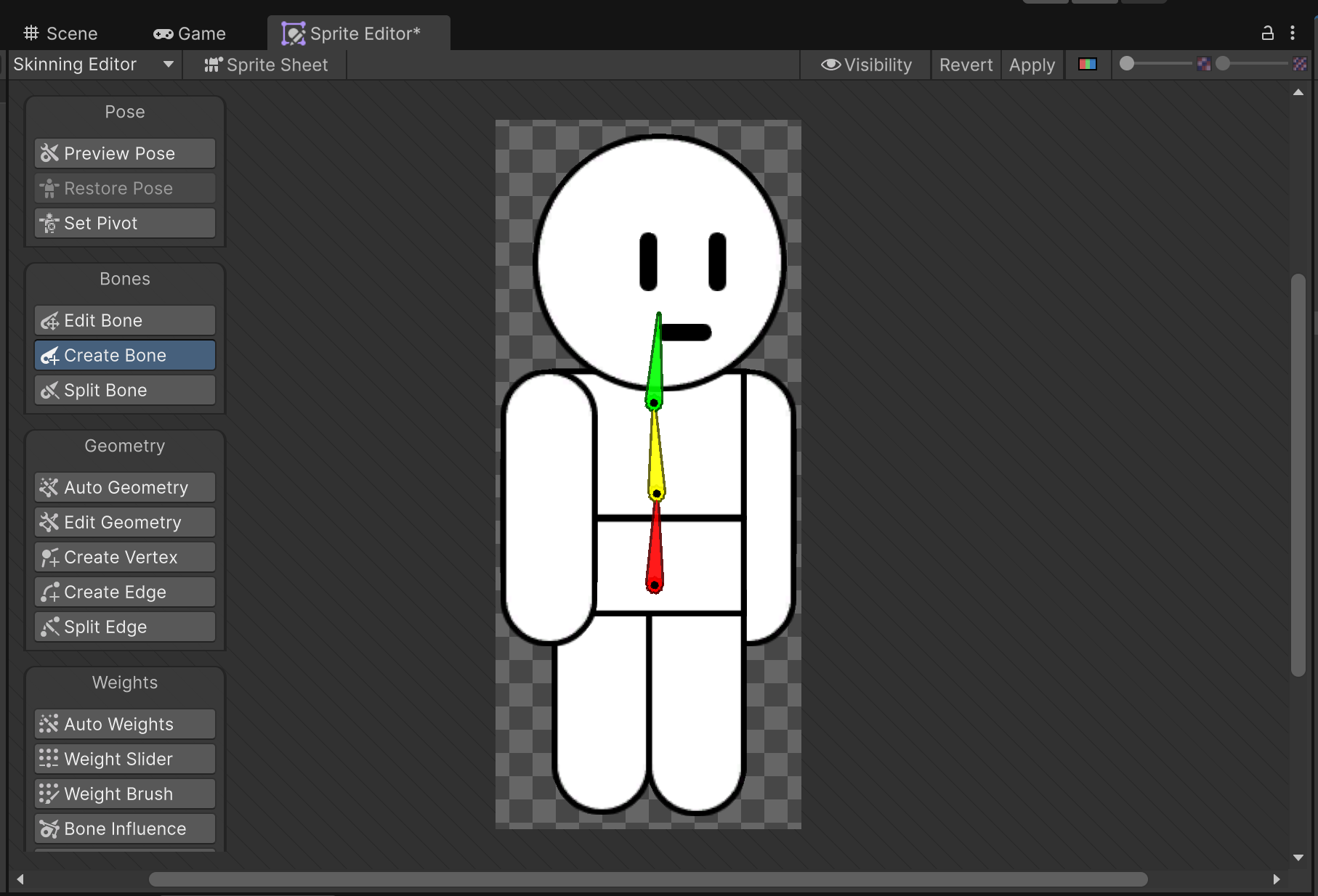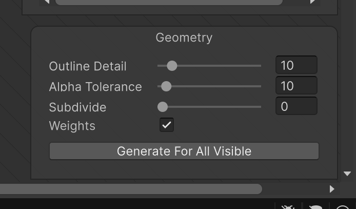 오토 지오메트리로 개별 본과 스프라이트를 연결하여 Weight를 부여할 수 있다. Generate For All Visible을 눌러서 모든 영역에 자동으로 처리가 되도록 한다.