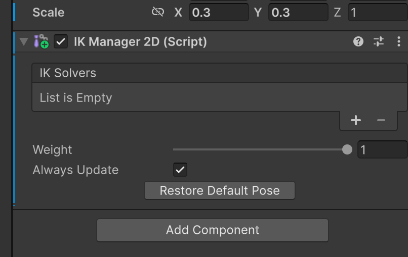 Player 박스의 위치에 Character가 위치하도록 조정하고, Character의 Inspector에 IK Manager 2D 컴포넌트를 삽입힌다.