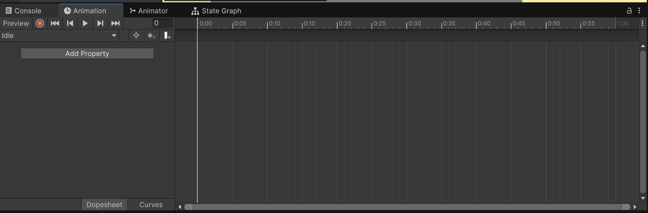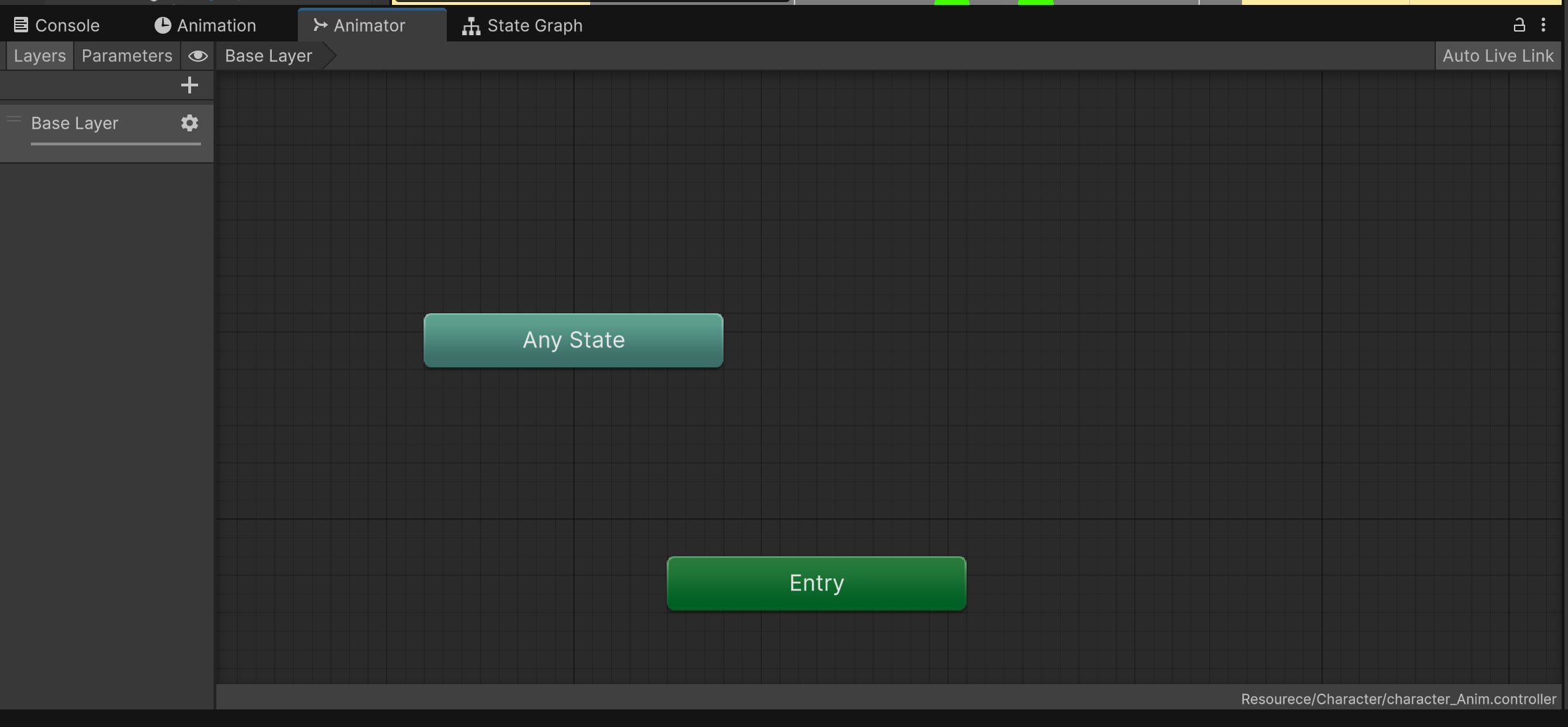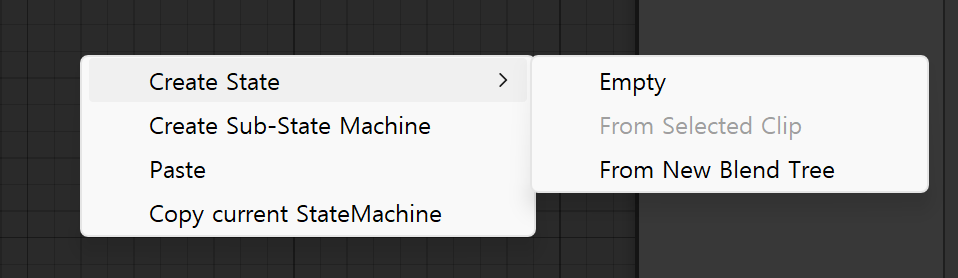 애니메이터를 더블 클릭하면 위와 같이 창이 형성된다. 마우스 오른쪽 버튼 > Create State > Empty를 선택하여