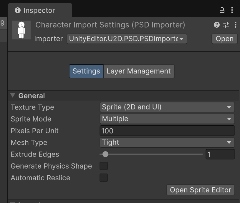 임포터 설정을 UnityEditor.U2D.PSD.PSDImporter 로 지정.